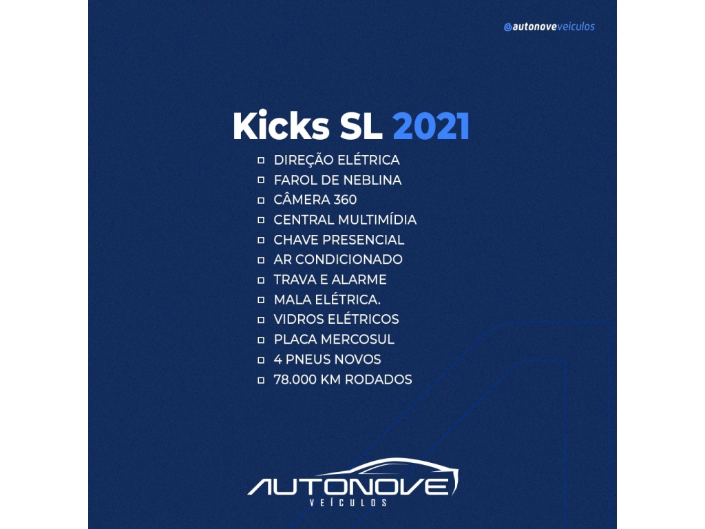 CERTEZA DE UM BOM NEGÓCIO ??? KICKS SL 2021 ?Direção elétrica ?farol de neblina ?câmera 360 ?central multimídia ?chave presencial ?Ar condicionado ?Trava e alarme ?. Mala elétrica.? Vidros elétricos ? placa mercosul ?. 4 pneus novos ? 78.000 km ?? flex?? R$ ??RECEBEMOS SEU USADO NA TROCA COM A MELHOR AVALIAÇÃO DO MERCADO ? TAXAS DE FINANCIAMENTO IMPERDÍVEIS ?? VEM COMFERIRhttps://autonovemultimarcas.com.br??RUA PEDRO FIRMINO S/N, BAIRRO BRASÍLIA 83998315228